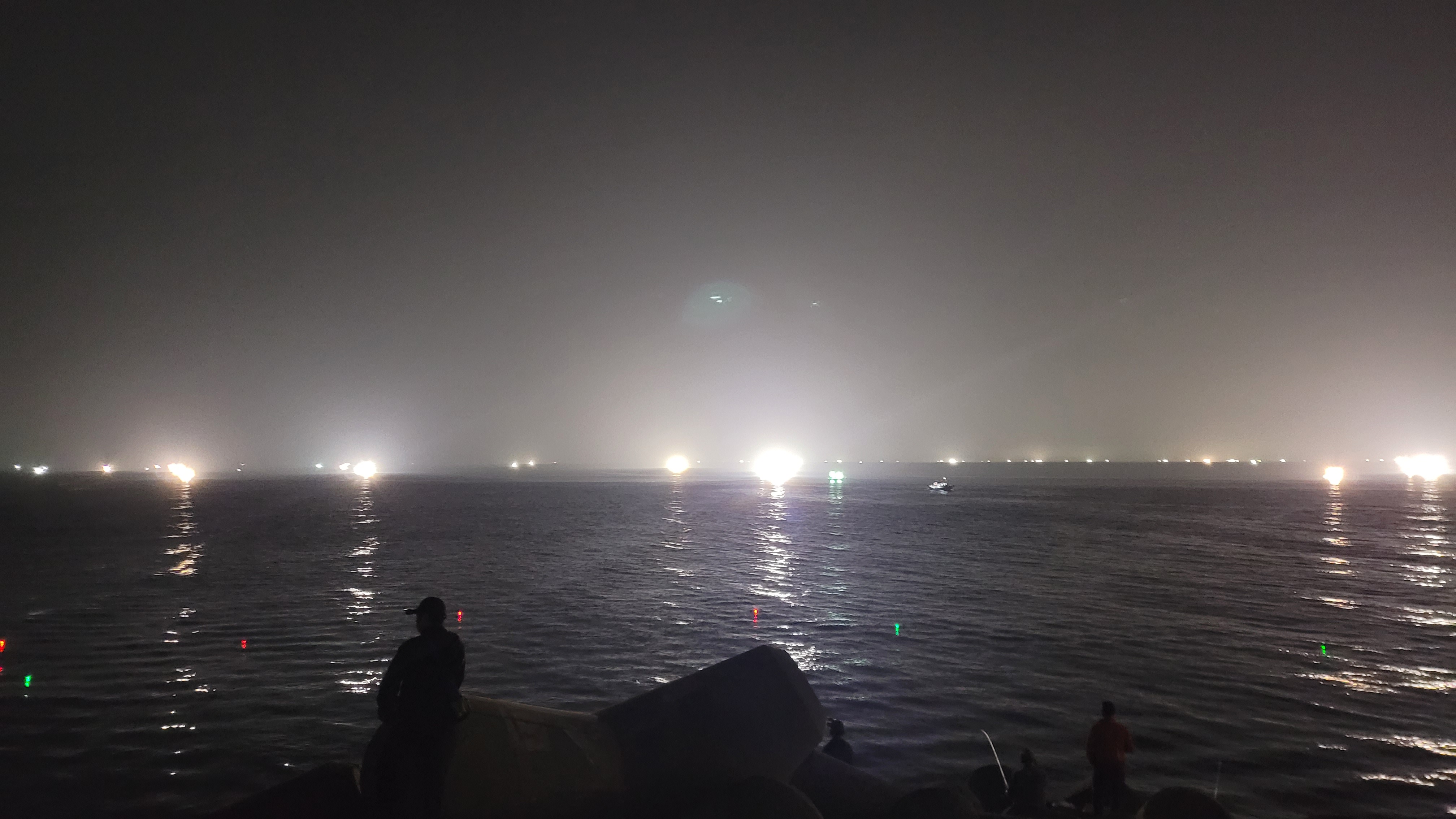 밤에 바다로 산책을 나와 낚시꾼들을 보니